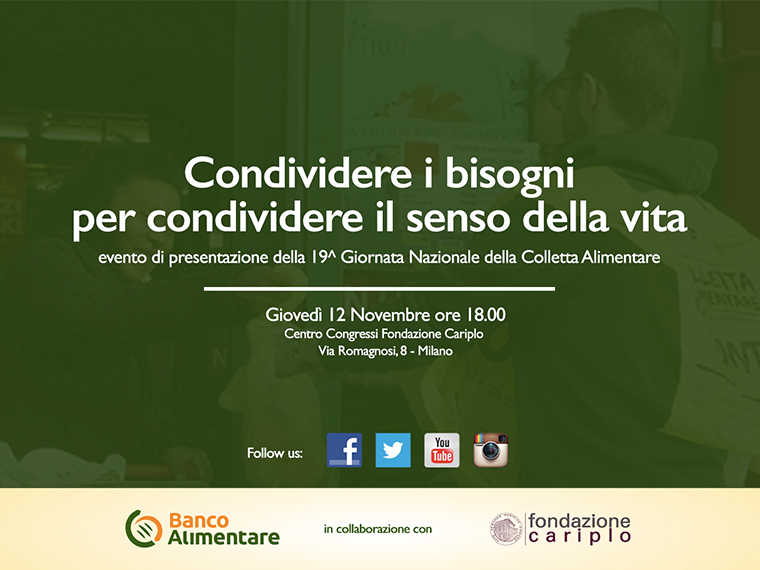 Lo scorso 12 Novembre Fondazione Cariplo ha promosso l'evento per il lancio della 19esima edizione della Giornata Nazionale della Colletta Alimentare, dal titolo Condividere i bisogni per condividere il senso della vita e che avrà luogo il 28 Novembre prossimo.